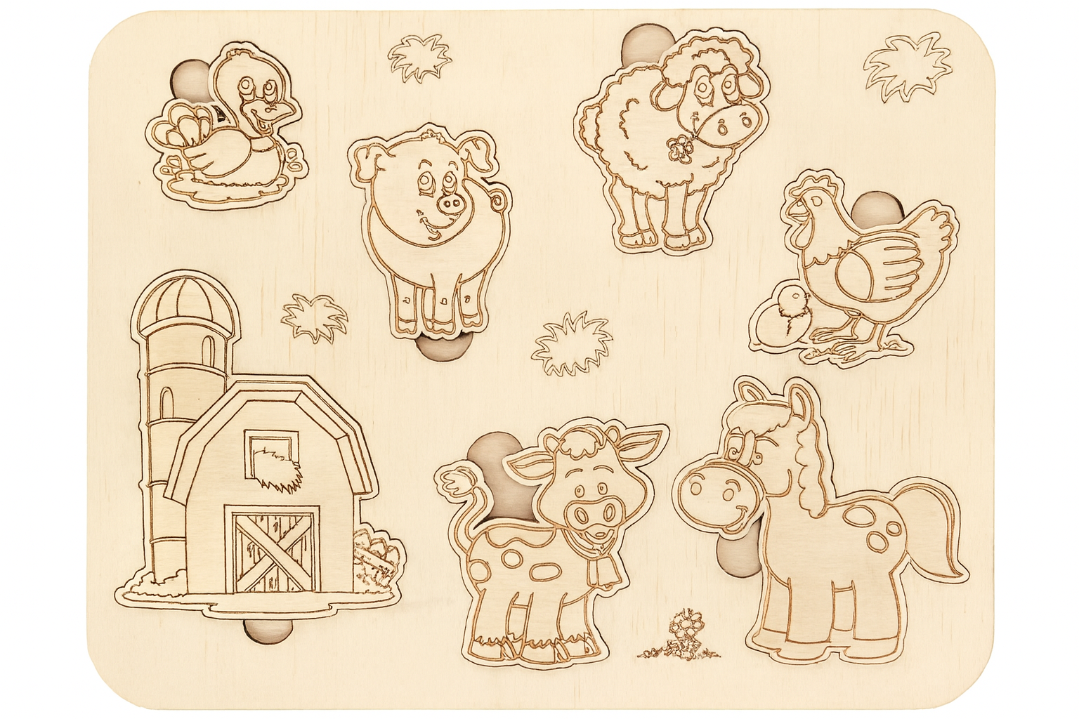 Bring the barnyard to life with this adorable wooden farm animal puzzle, perfect for little hands and curious minds! Each piece is laser-engraved for precision and features charming, chunky shapes of favorite farm friends — a cow, horse, sheep, pig, duck, chicken, and a cozy barn.